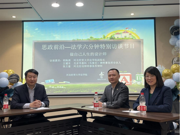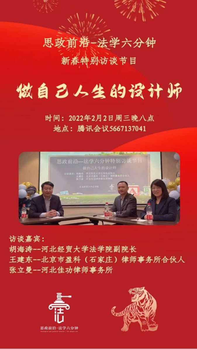 本期为同学们带来的是法学六分钟的特别节目——做自己人生的设计师。作为首次特别栏目,我们有幸邀请到了北京盈科(石家庄)律师事务所的合伙人王建东律师,以及河北佳功律师事务所的张立曼律师,并由乐天使副经理胡海涛老师作为本次活动的主持人,与嘉宾进行访谈交流。
