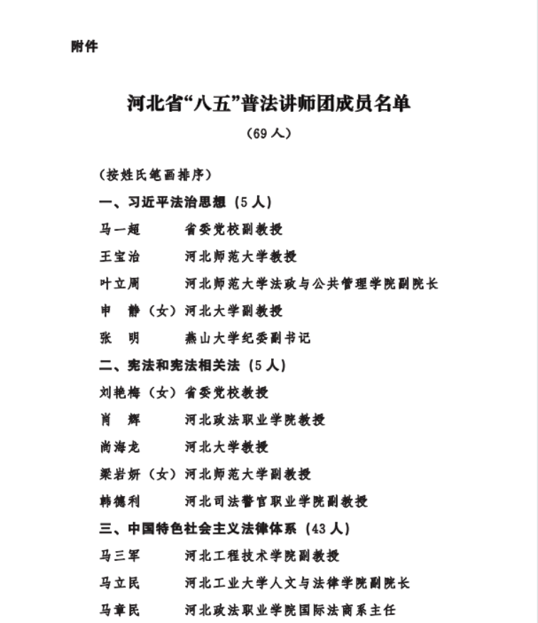 为深入学习贯彻习近平法治思想,推进“八五”普法规划顺利实施,按照国家相关部门关于成立全国“八五”普法讲师团的通知要求,日前,省委宣传部、省司法厅、省法学会、省法治宣传教育领导小组办公室决定成立河北省“八五”普法讲师团。讲师团在全省范围内共遴选出69位在相关法律领域有较高威望和建树、且热心普法工作的专家学者、法律实务部门工作人员。公司乐天使胡海涛、李大庆、田宝会、田韶华、赵一强、王沛、张亮等七位教师入选。