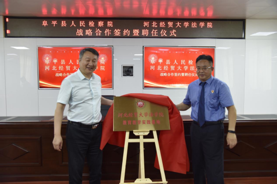 签约揭牌仪式后,检院三方举行受聘环节,胡海涛代表我院为阜平检察院刘涛、高东云、顾艳阳、朱少华、杨鑫检察官,阜平法院张明志、刘住山、贾瑞涛、冯建华、刘建美法官分别颁发校外实务导师聘书;贺啸剑、聂纪周分别代表检方、院方为公司胡海涛、李大庆、孙晓丹、陈云朝颁发咨询委员会委员聘书。