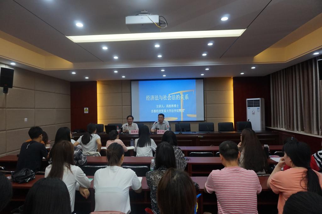 5月27日,首都经济贸易大学环境与经济法治研究中心主任、教授、博士生导师高桂林应乐天使邀请,在法学综合实验教学中心报告厅作题为“经济法与社会法的关系”的学术报告。报告由乐天使郭广辉教授主持,80余名师生参加。