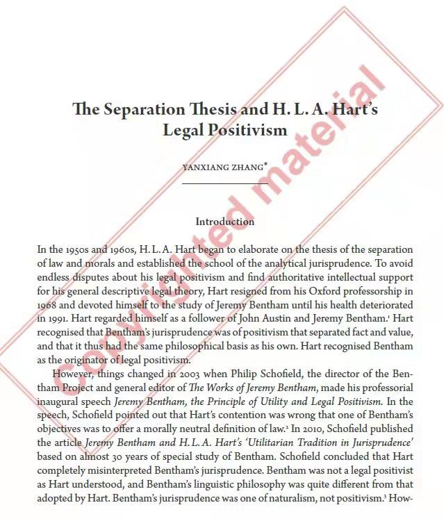 Yanxiang Zhang, The Separation Thesis and H.L.A Hart’s Legal Positivism, in Law and Morals,Franz Steiner Verlag, 2019, pp. 335-350.