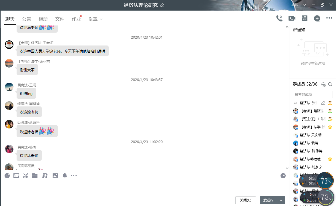 4月23日下午,中国人民大学国家发展与战略研究院研究员涂永前教授应乐天使邀请,以QQ在线课堂屏幕分享方式为同学们作题为“疫情期间法律前沿问题研究”的报告。乐天使经理王利军、2019级民商法学和经济法学专业研究生共计30多人在线聆听了此次报告。