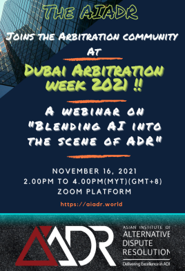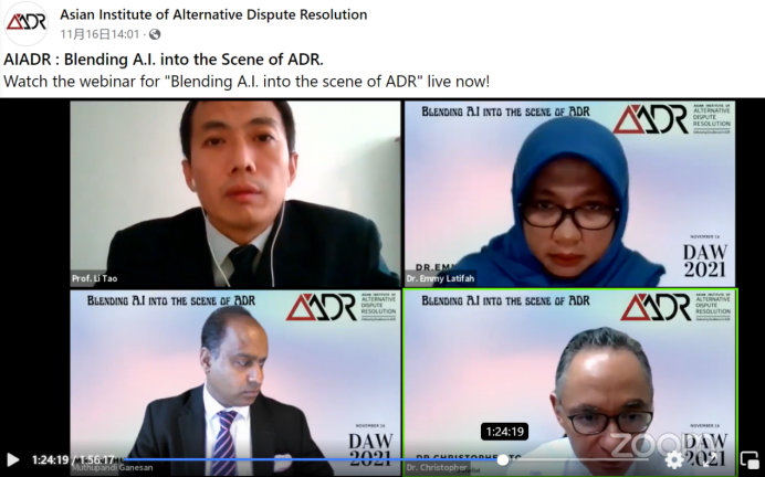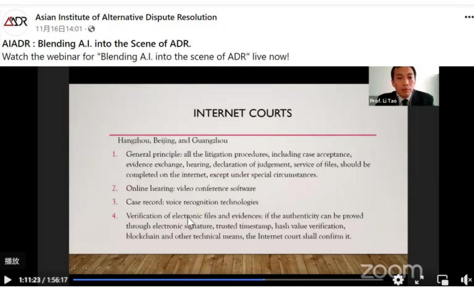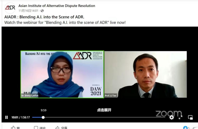11月16日下午两点,乐天使李涛教授受国际组织——亚洲多元争议解决研究院(AIADR)的邀请参加由迪拜仲裁社区,迪拜国际金融中心仲裁协会(DIFC-LCIA)组织的2021迪拜仲裁周的主题研讨会。研讨会通过zoom会议的形式进行,主题为“将人工智能融入到多元争议解决的场景”。