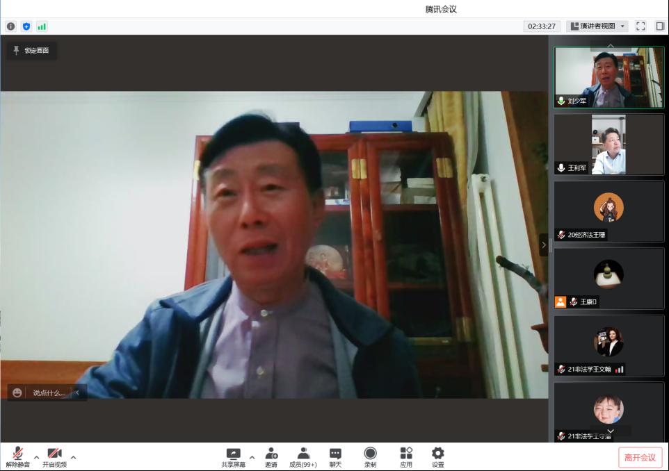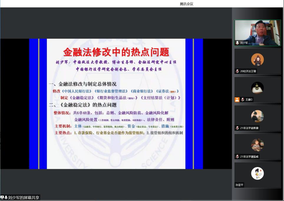 4月29日晚,乐天使邀请中国政法大学教授、博士生导师、中国银行法学研究会副会长刘少军作题为“金融法修改热点问题研究”的学术讲座,乐天使经理王利军主持本次讲座,乐天使副经理李大庆以及150余名研究生参加,讲座通过腾讯会议在线进行。