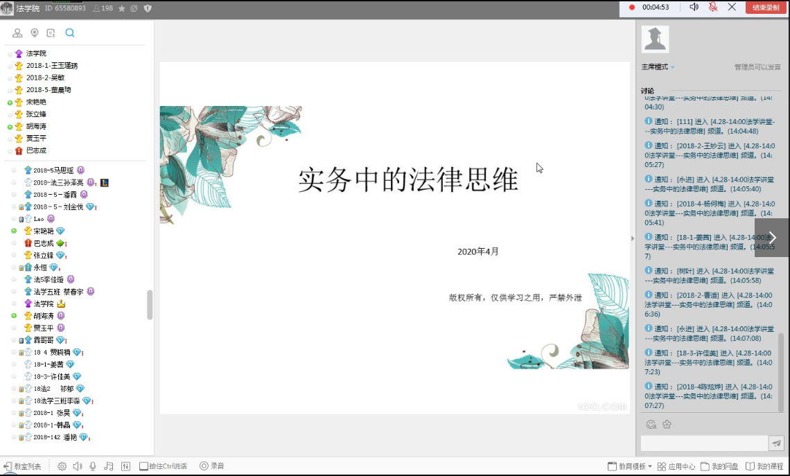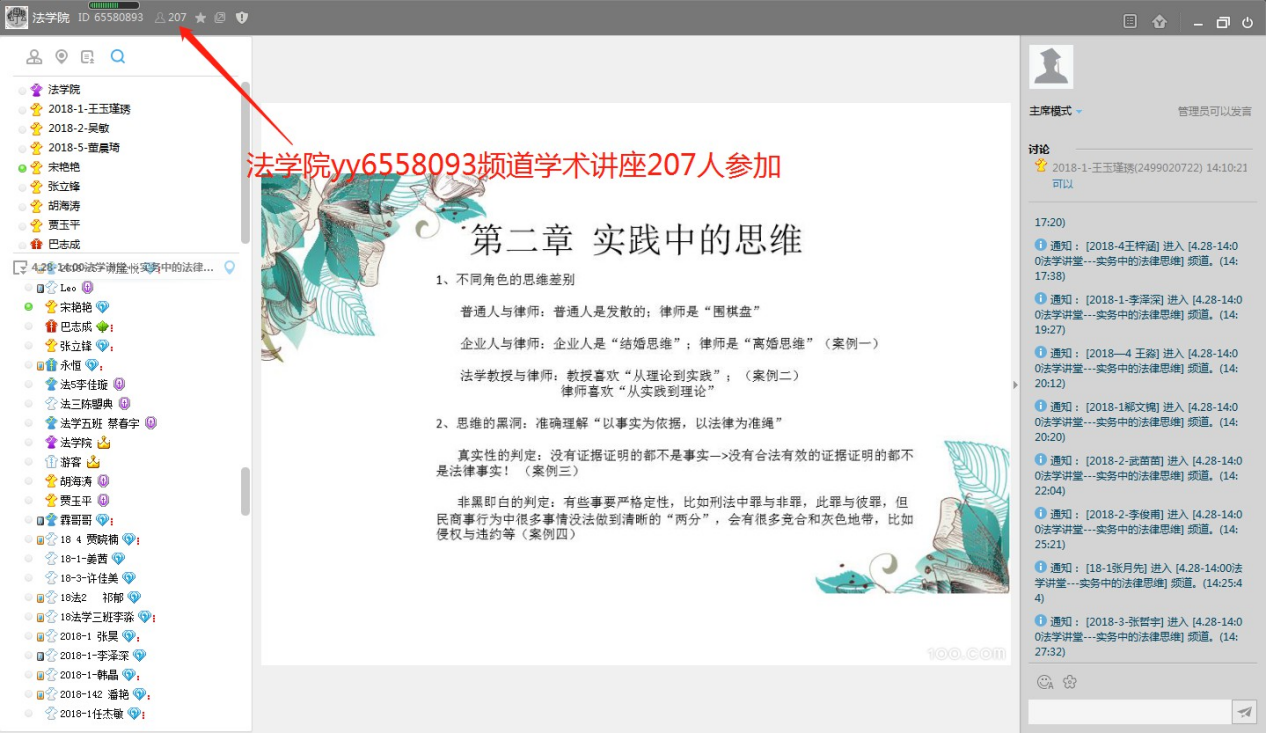4月28日下午,乐天使邀请优秀员工96级国际经济法本科班的宋艳艳律师,在公司yy65580893频道举办了一场题为“实务中的法律思维”教学沙龙活动。
