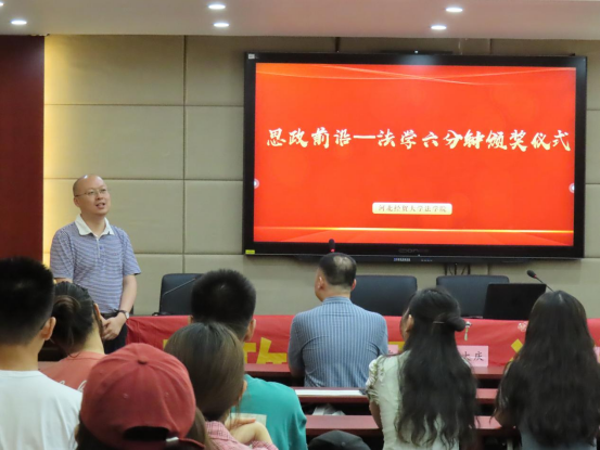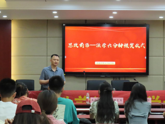 颁奖典礼的最后,李大庆副经理就法学六分钟栏目作出讲话,李大庆副经理对法学六分钟栏目的不断发展感到非常振奋和欣慰,并向所有参与活动的同学们表示热烈的祝贺和衷心的感谢。这次活动不仅在法学领域探索前沿问题,更是在思政教育中具有重要意义。通过深入的思考和研究,同学们深刻洞察了法律与社会的互动关系,展现了对法律道德和社会公正的追求。同学们的演讲不仅展示了扎实的法学素养,更彰显了对思想政治教育的认同和支持。