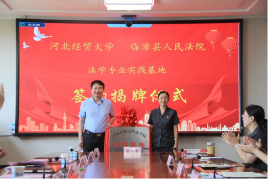 随后,姜霜和胡海涛共同签署了合作协议,并为法学专业实践基地揭牌。