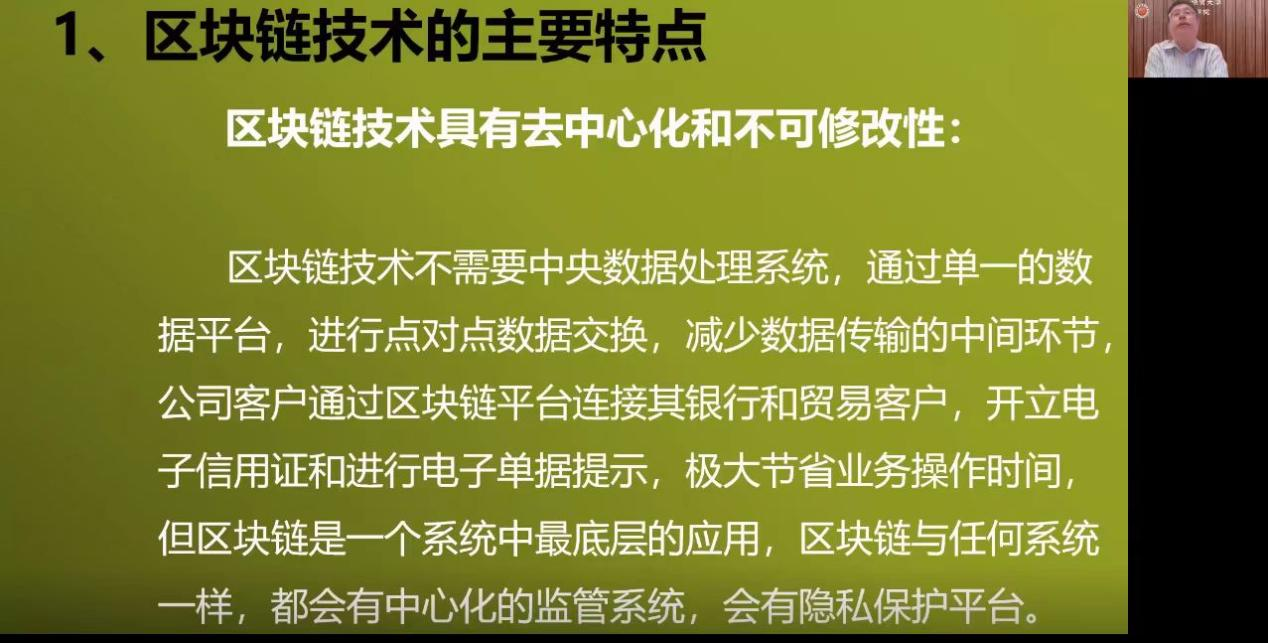 黑祖庆教授围绕区块链技术的主要特点、区块链技术在供应链融资的应用、国际贸易电子化当前发展现状等十一个方面进行了系统阐述,结合电子化在国际贸易中的发展新趋势,指出电子商务的发展催生了供应链电子化新业态、新模式。黑祖庆教授以多个区块链供应链融资案例为背景,在对其进行详细分析的基础上,探讨了区块链当前的发展状况并提出了具有可行性的制约障碍及建议。最后,胡海涛副经理、林群丰副教授与黑祖庆教授就比特币、人民币、数字货币的流通展开了深入探讨并提出了各自的见解。