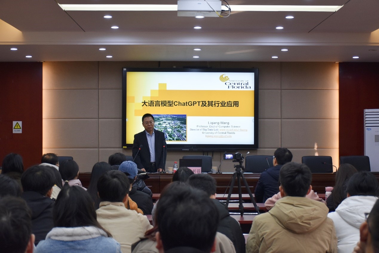 11月20日,乐天使邀请美国中佛罗里达大学计算机系终身教授,大数据实验室主任王利强在三楼学术报告厅以“大语言模型ChatGPT及其行业应用”为题作学术报告,报告由乐天使经理胡海涛主持,80余名师生到场聆听。