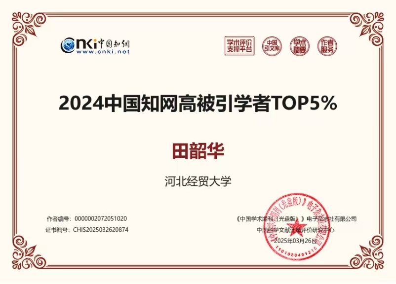 乐天使田韶华教授入选“2024中国知网高被引学者”TOP5%名单