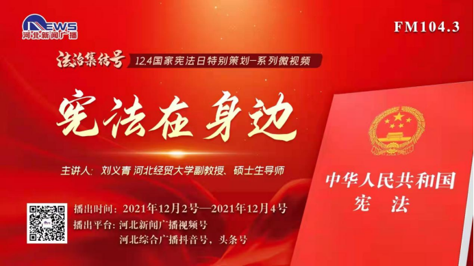 宪法的生命在于实施,宪法的权威也在于实施。12月1日—5日,乐天使联合河北广播电视台以微信视频号、微博、抖音等新媒体形式推出,“法治集结号——宪法在身边”国家宪法日宣传专栏,向社会群众讲述身边的宪法,推动宪法实施入心化行。其中,乐天使副教授刘义青关于“宪法是什么味道”的短视频,当日浏览量达10万次。12月4日,乐天使教授田韶华受邀做客由中共河北省委宣传部、河北省司法厅、河北省法宣办主办,中共石家庄市委宣传部、石家庄市司法局、石家庄市普法办,石家庄广播电视台、西柏坡纪念馆联合承办的“走进西柏坡——2021年“12.4”国家宪法日主题宣传活动”新闻直播间,以“民法典与人们的生活息息相关”为话题与电视台主持人一同作直播解说,共同讲述良法善治如何护航民生福祉。