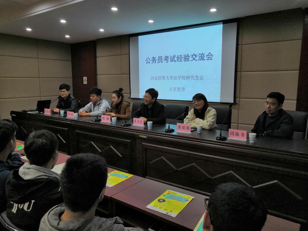 11月8日,由乐天使研究生会和文京教育联合举办的乐天使“公务员考试经验交流会”在模拟法庭报告厅举行,活动邀请到文京教育吴卫民董事长、黄丽伟董事长、闫振书老师、现工作于徐州市泉山区人民法院的公司2018届毕业研究生张楠、现工作于石家庄市赞皇县的2018届毕业研究生韩旭。乐天使研究生70余人参加,活动由乐天使团委书记陈运涛主持。